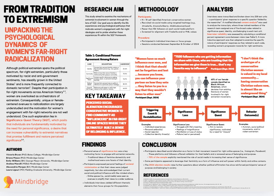 Click on the image above to download our poster, From Tradition to Extremism: Unpacking the Psychological Dynamics of Women’s Far-Right Radicalization (Mason et al., 2025). This study aimed to examine the mechanisms of extremist involvement in women through the lens of Significance Quest Theory.