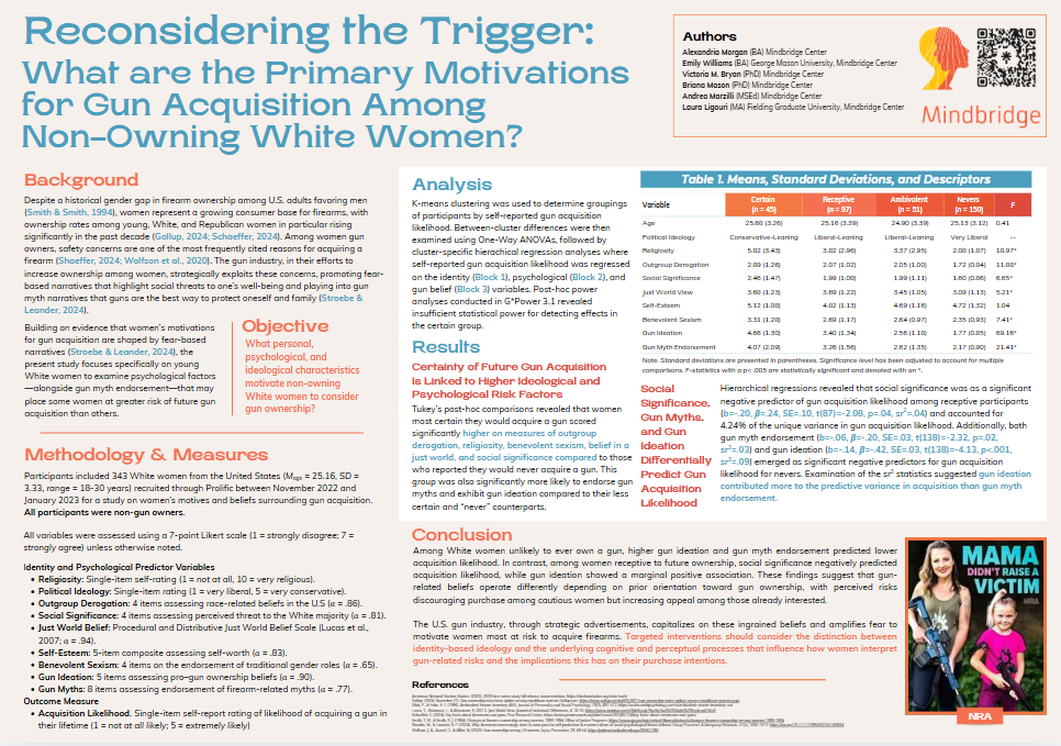 Click on the image above to download our poster, Reconsidering the Trigger: What are the Primary Motivations for Gun Acquisition Among Non-Owning White Women? (Morgan et al., 2026). In this research, we sought to understand the personal, psychological, and ideological characteristics motivating non-owning White women to consider gun ownership.